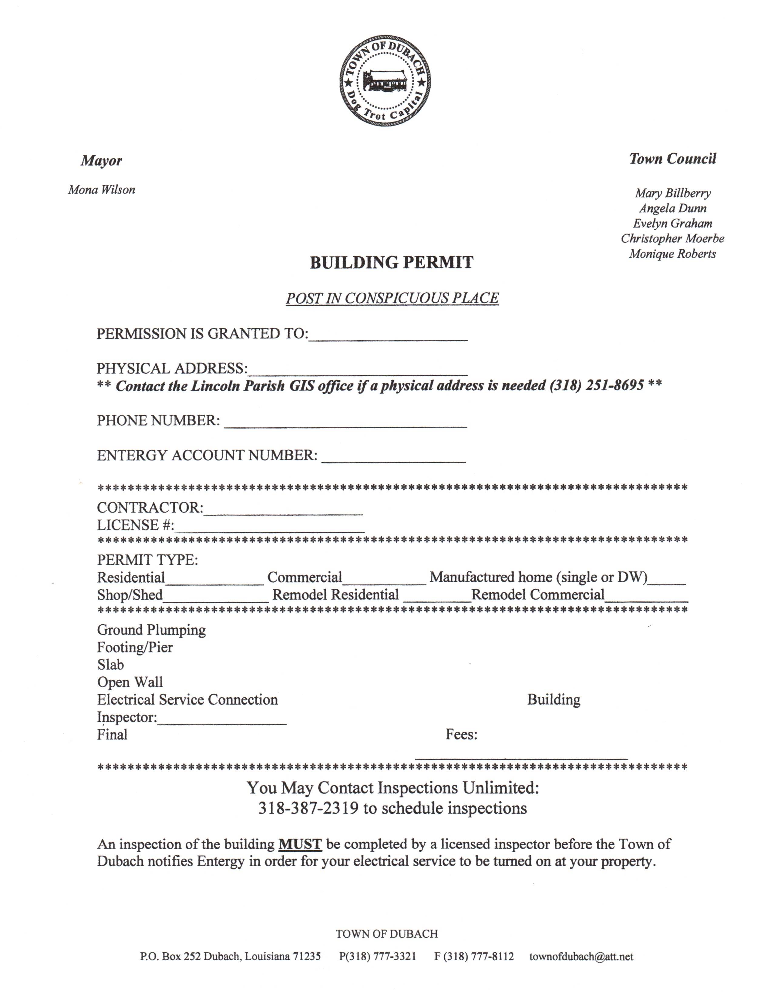To obtain a permit for both residential and commercial uses, simply download the forms below (if available) or give us a call and we will be happy to provide you with the necessary forms. The following fees must be paid at Dubach Town Hall before the permit is valid.